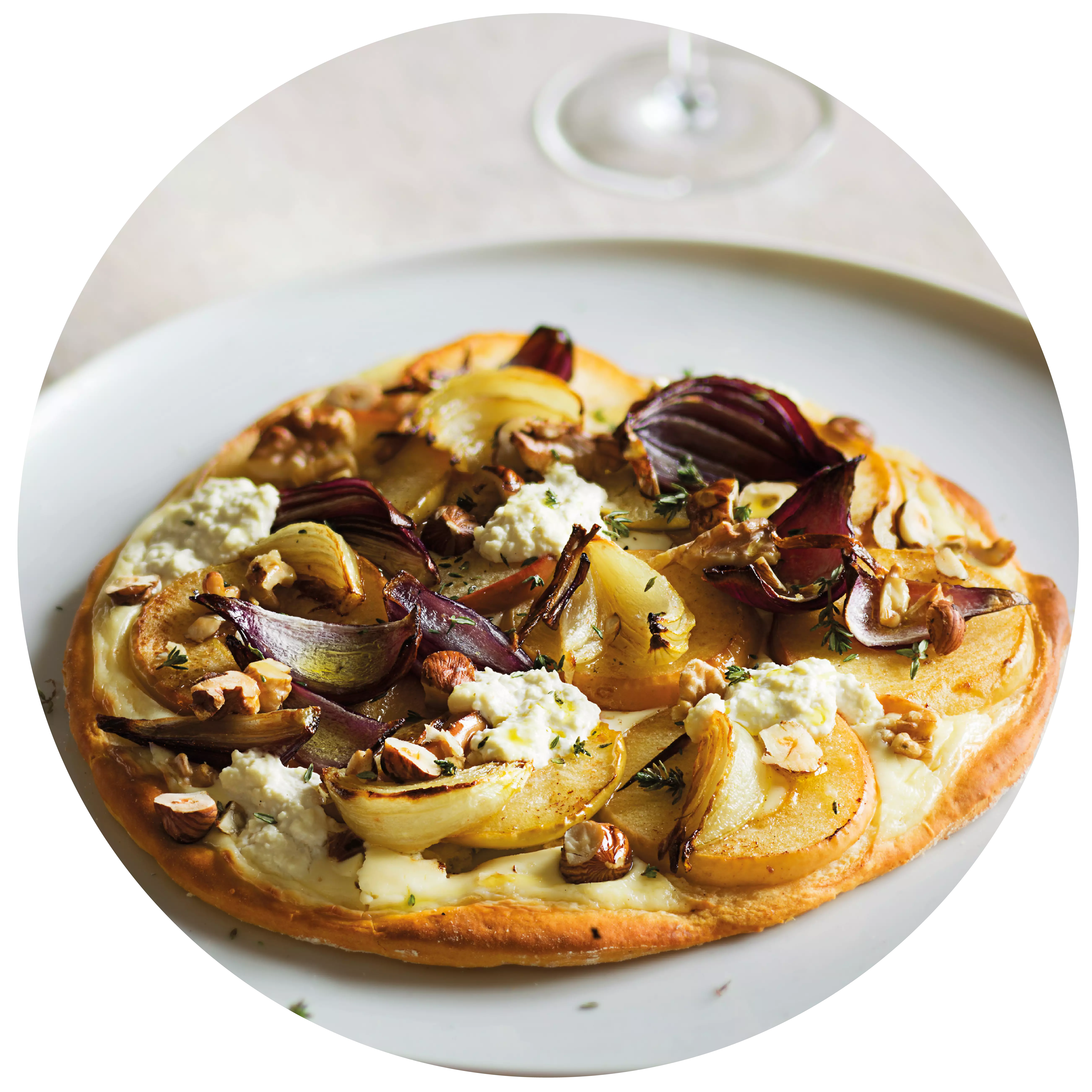 Fördela crème fraiche jämnt över tarte flambée och toppa med äppelskivor och lökbitar. Fördela färskosten ovanpå och strö över valnötterna. Strö över lite salt och peppar.