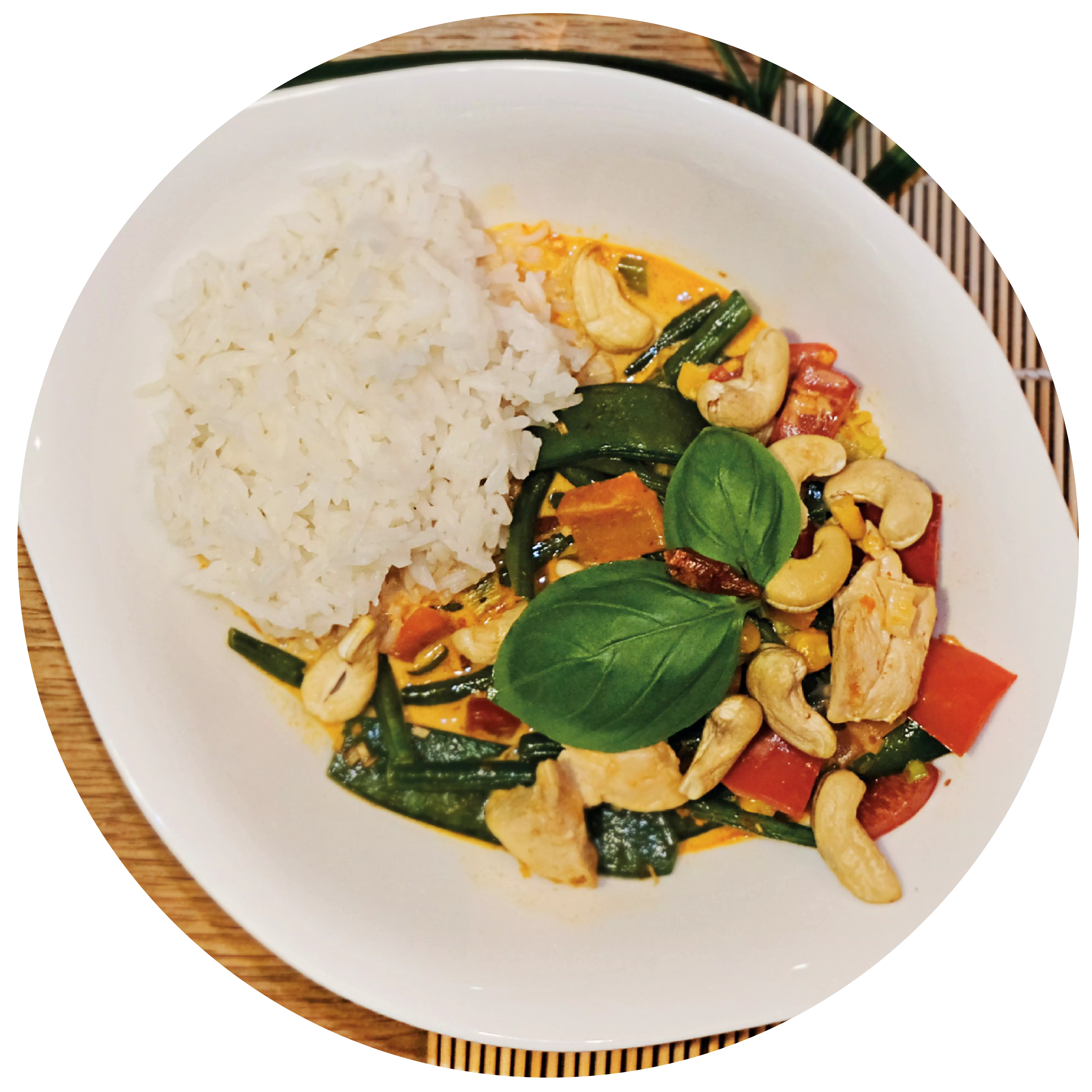 Tillsätt kokosmjölk och kycklingfond och lägg sedan grönsakerna i woken. Låt koka upp, tillsätt sedan 2 msk sojasås, 1 msk fisksås och låt sjuda på låg värme i cirka 5 minuter. Tillsätt sedan kycklingstrimlorna och låt sjuda i ytterligare 5 minuter. Servera med ris och garnera med cashewnötter som avslutning.